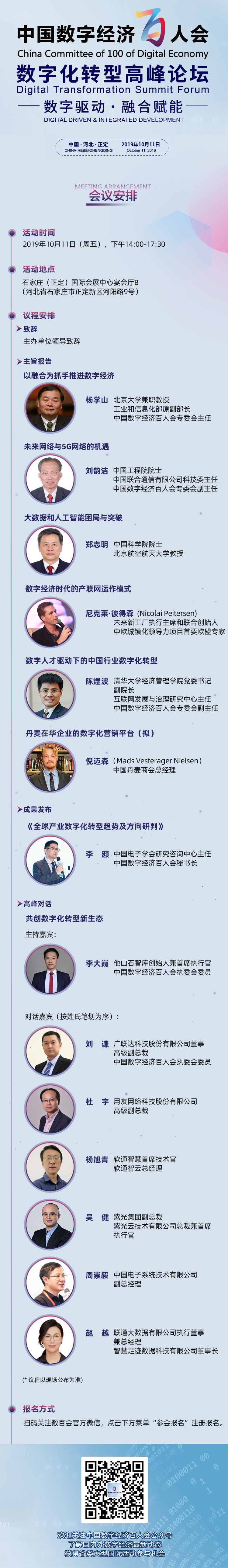 為加快推動實體經(jīng)濟與數(shù)字經(jīng)濟融合發(fā)展,促進新舊動能轉(zhuǎn)換,培育新的經(jīng)濟增長點,助力數(shù)字經(jīng)濟強國建設。經(jīng)黨中央、國務院批準,由工業(yè)和信息化部、河北省人民政府共同主辦的“2019中國國際數(shù)字經(jīng)濟博覽會”(以下簡稱“博覽會”)將于10月10日至13日在石家莊(正定)國際會展中心舉行。受主辦方委托,中國電子學會、中國數(shù)字經(jīng)濟百人會定于博覽會期間舉辦“中國數(shù)字經(jīng)濟百人會年度工作會暨數(shù)字化轉(zhuǎn)型高峰論壇”。